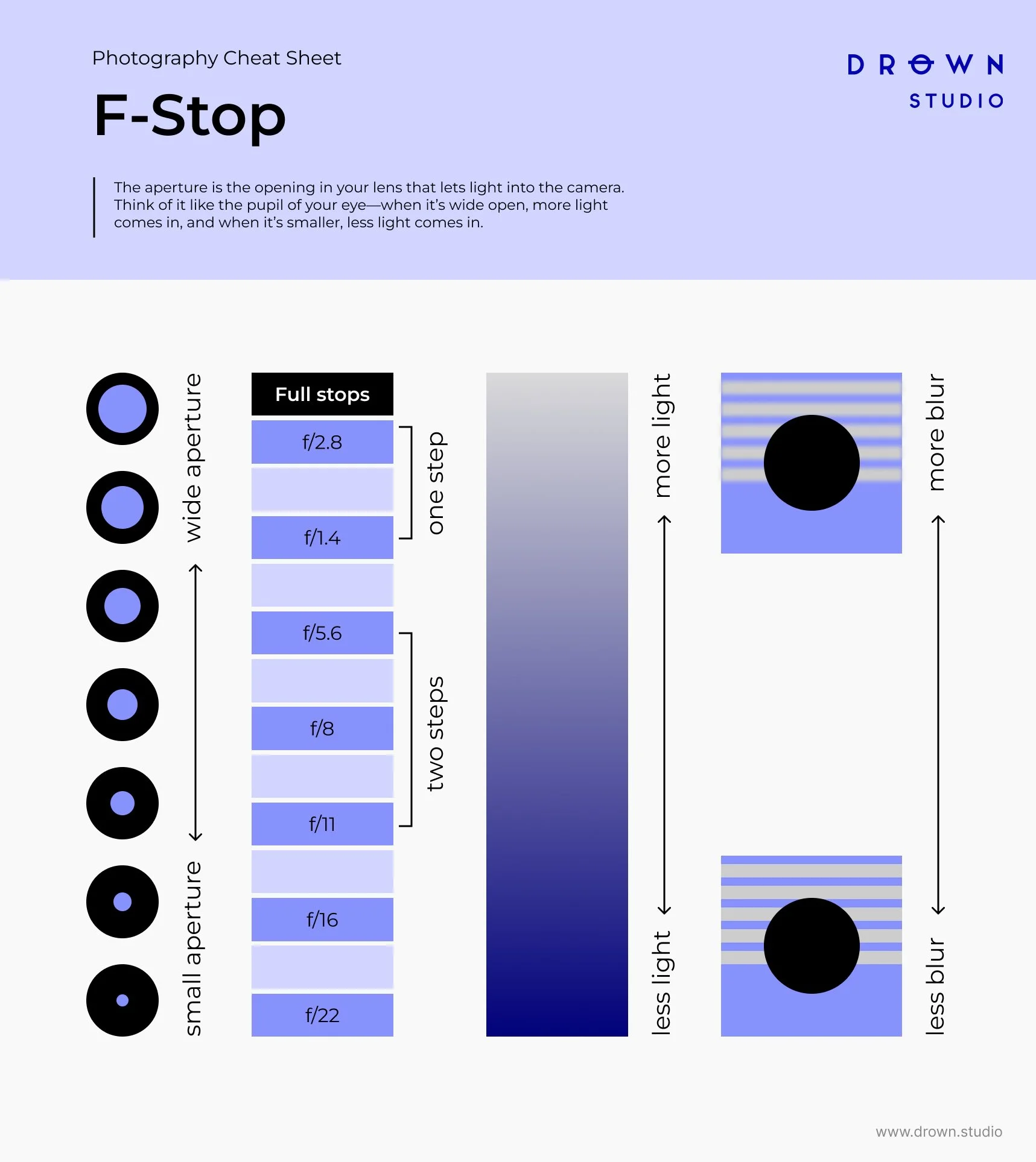 An f-stop refers to the aperture setting on your camera. The aperture is the opening in your lens that lets light into the camera. Think of it like the pupil of your eye—when it’s wide open, more light comes in, and when it’s smaller, less light comes in.